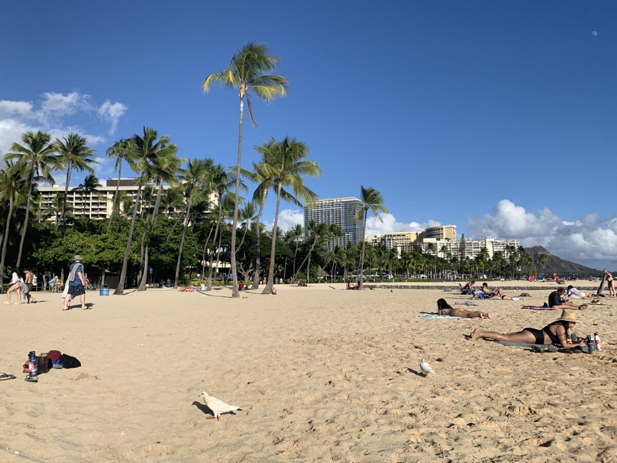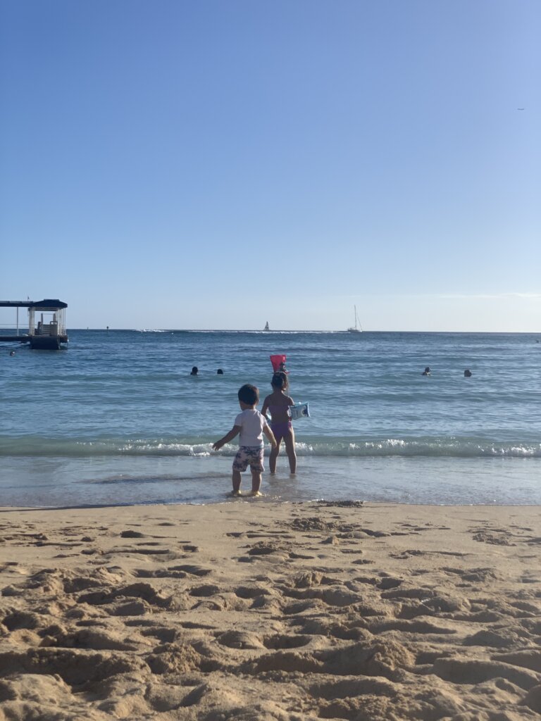 たしか名前はカハナモクビーチ。事前にヒルトンハワイアンビレッジが誇るラグーンビーチを現地調査しておいたのですが、砂浜がめちゃくちゃに固くて、ちょっと子供たちには危険だなと判断。