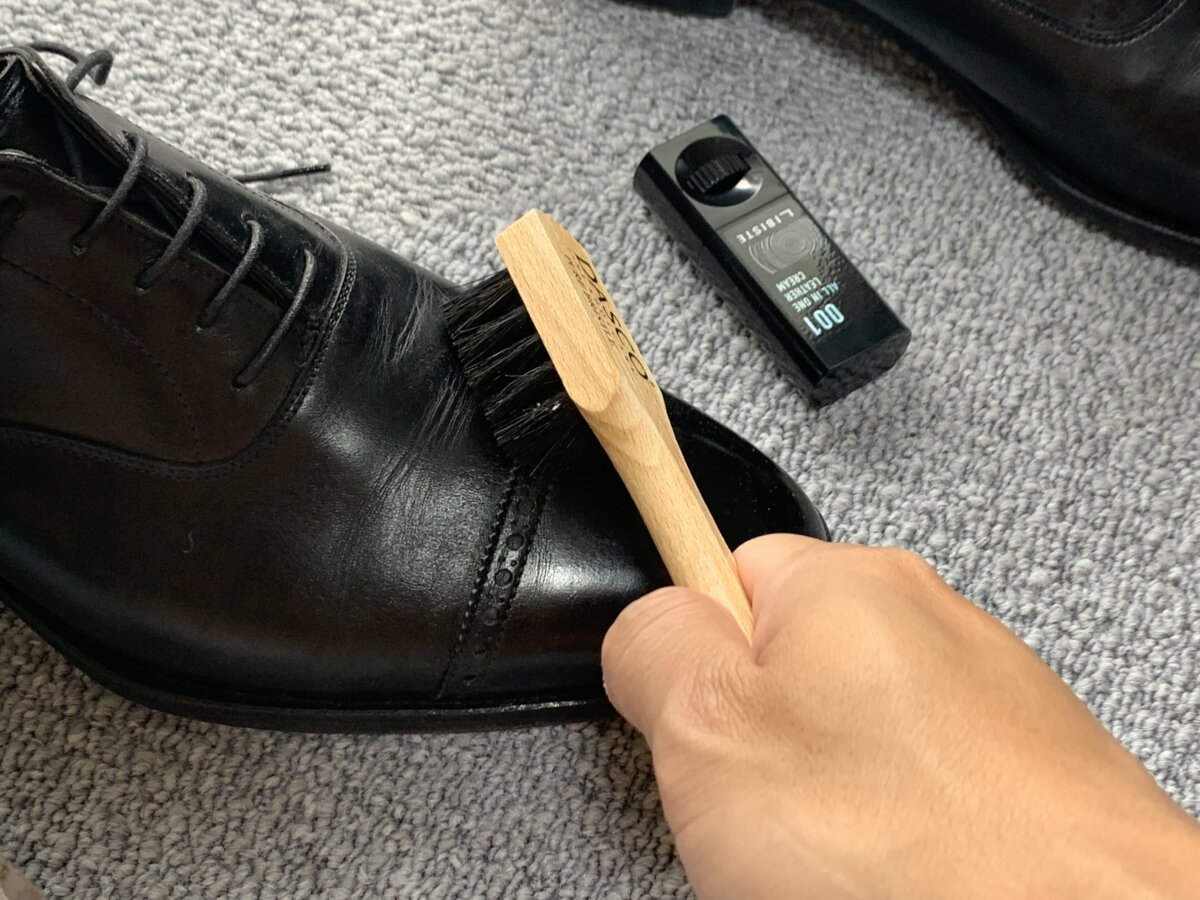 靴全体に塗り込んだLIBISTEオールインワンクリームをブラシで伸ばしていきます。