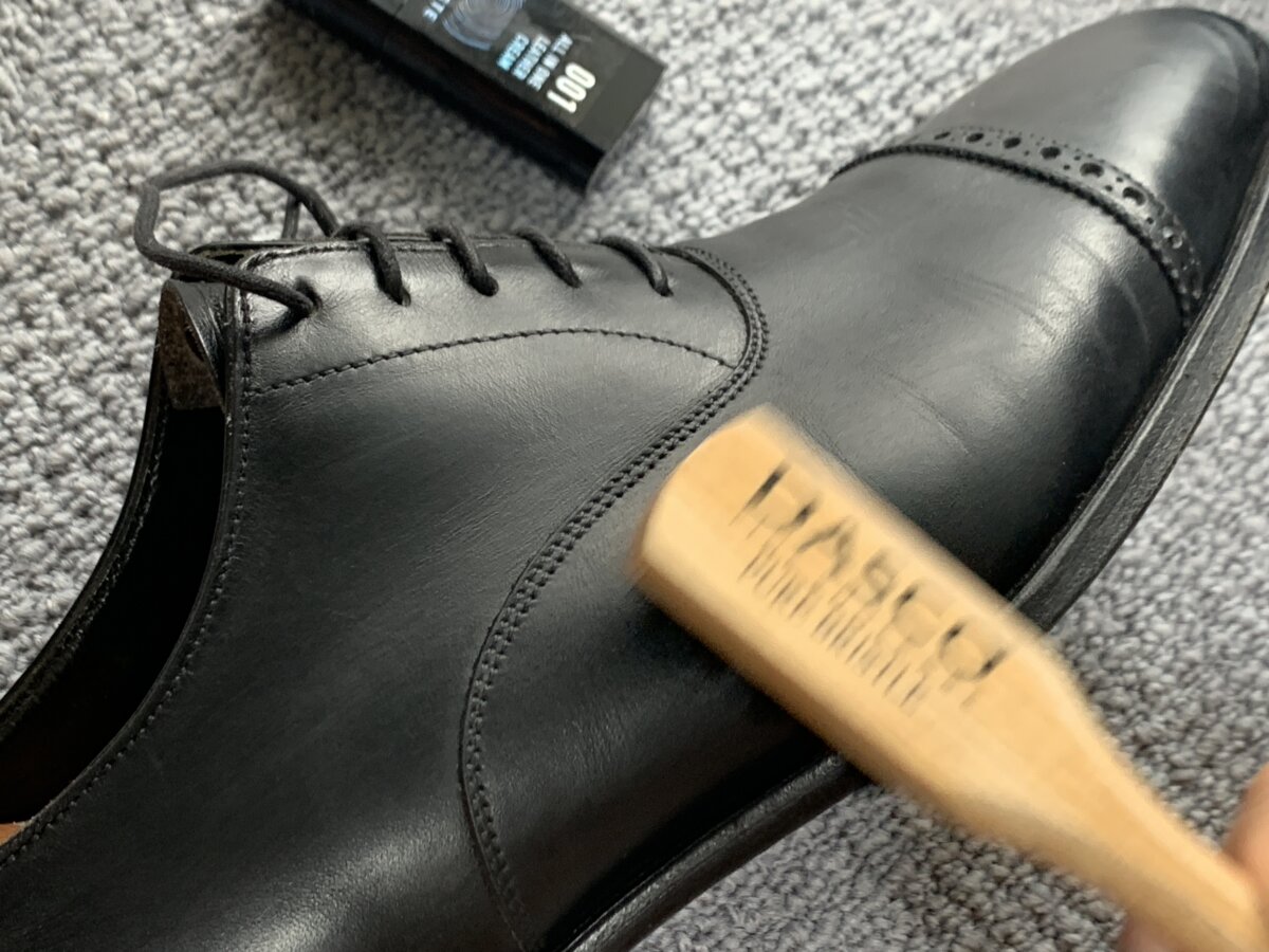 ブラシはツヤ革であればどの動物毛でも構いません。そこまでヤワな皮革は革靴に使われませんから。軽い力加減でササっと払っていきましょう!